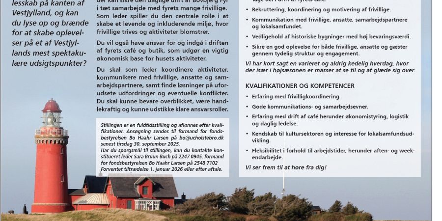 ER DU VORES NYE FYRMOSTER/MESTER? Af Bovbjerg Fyr 23. August 2025 Bovbjerg Fyr søger ny daglig leder. Se mere her: